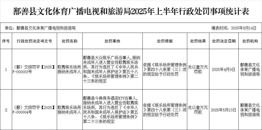 鄯善縣文化體育廣播電視和旅游局2025年上半年行政處罰事項統計表