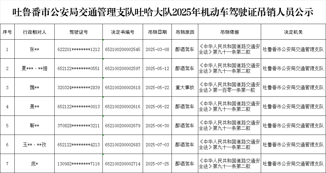 為促進吐魯番市公安交管部門嚴格規范公正文明行政執法,根據《中華人民共和國道路交通安全法》、《中華人民共和國政府信息公開條例》規定要求,吐魯番市公安局交通管理支隊吐哈大隊現依法向社會予以公示2025年7名機動車駕駛證吊銷人員名單。