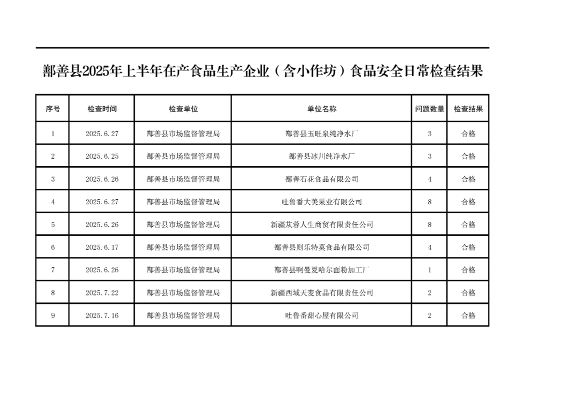 鄯善縣2025年上半年在產(chǎn)食品生產(chǎn)企業(yè)(含小作坊)食品安全日常檢查結(jié)果