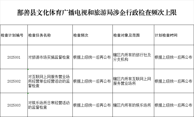 鄯善縣文化體育廣播電視和旅游局涉企行政檢查頻次上限