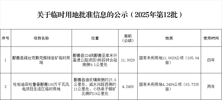 關(guān)于臨時用地批準(zhǔn)信息的公示(2025年第12批)